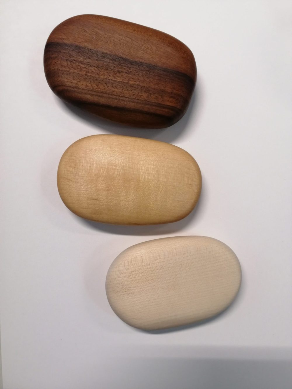 Leseni masažni kamni nastajajo v Barkini lesni delavnici. Delovni inštruktor nažaga obliko, zbrusita pa jih Maja in Marjanca.