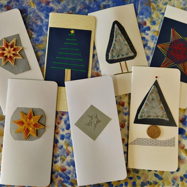 V delavnicah smo za vas pripravili najrazličnejše božično/novoletne voščilnice (skupaj s pisemskimi ovojnicami), lesene rožice, pručke, ovratne metuljčke, lesene smrečice, predpasnike ter druge naše unikatne izdelke.