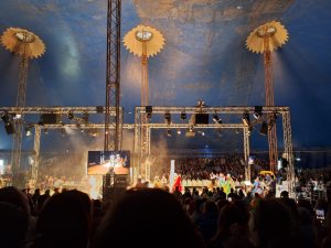 Po prihodu sta se skupaj s člani gostiteljske skupnosti s kombiji odpravila na dolgo potovanje v Saint-Anne-d’Auray (Bretanija), kjer jih je čakal pripravljen kamp z osrednjim prireditvenim šotorom, »food truck-i« ter bungalovi za spanje.