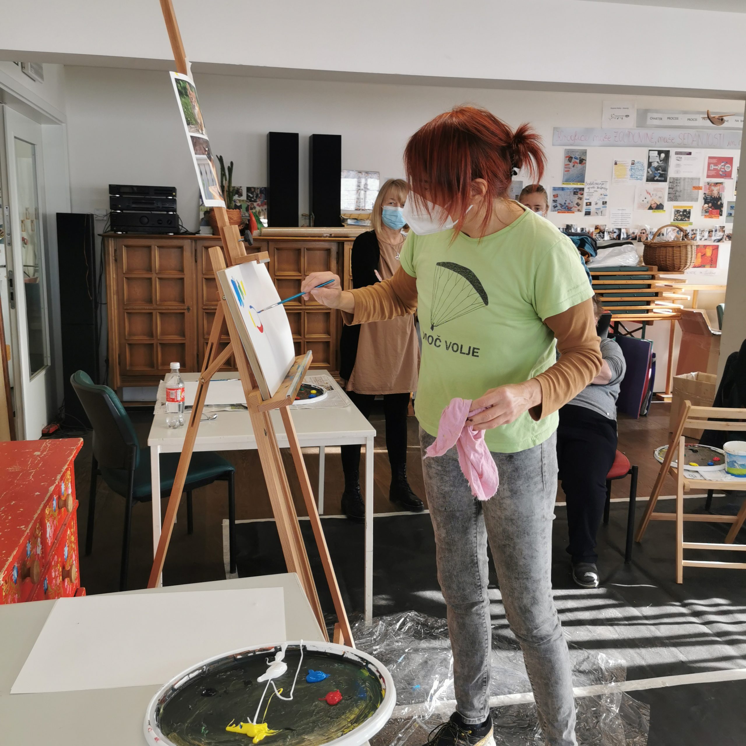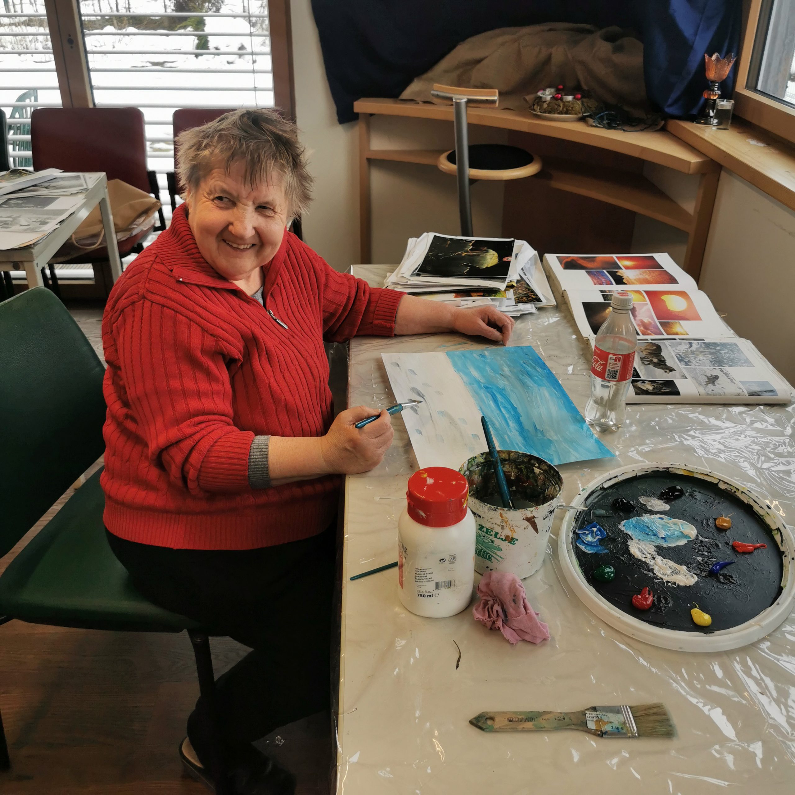 Pred začetkom ustvarjanja pripravimo prostor, zaščitimo tla in površine ter prinesemo opremo in materiale za slikanje. Skupaj z slikarko izberemo tematiko in tehniko ustvarjanja ter predloge (slike, s katerimi si pri ustvarjanju pomagamo). Potem nam slikarka razloži tehniko in na platno naslika primer. Nato začnemo z risanjem. Pri tem nam poleg slikarke pomagajo tudi spremljevalci in prostovoljci. Vsak po svojih najboljših močeh naslika umetnino. Ko končamo si med seboj pokažemoslike in se o njih pogovorimo. Pogledamo, kaj nam je najbolj všeč in kaj bi lahko popravili ter izboljšali.