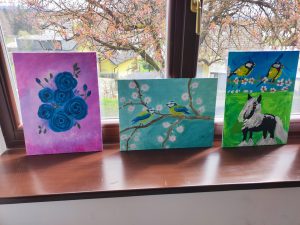 Zaščitili smo mize, pripravili palete z barvami, čopiče, vodo ter platna in si izbrali vsak svoje mesto ustvarjanja. Akademski slikarki Andreja Eržen in Renata Grmovšek sta predstavili tehniko in tematiko slikanja, pri kateri smo ideje lahko iskali tudi v natisnjenih predlogah. Nato smo se vsi skupaj lotili ustvarjanja, pri katerem so nam, poleg mentoric, nudili pomoč tudi spremljevalci in prostovoljki iz Nemčije ter Francije.