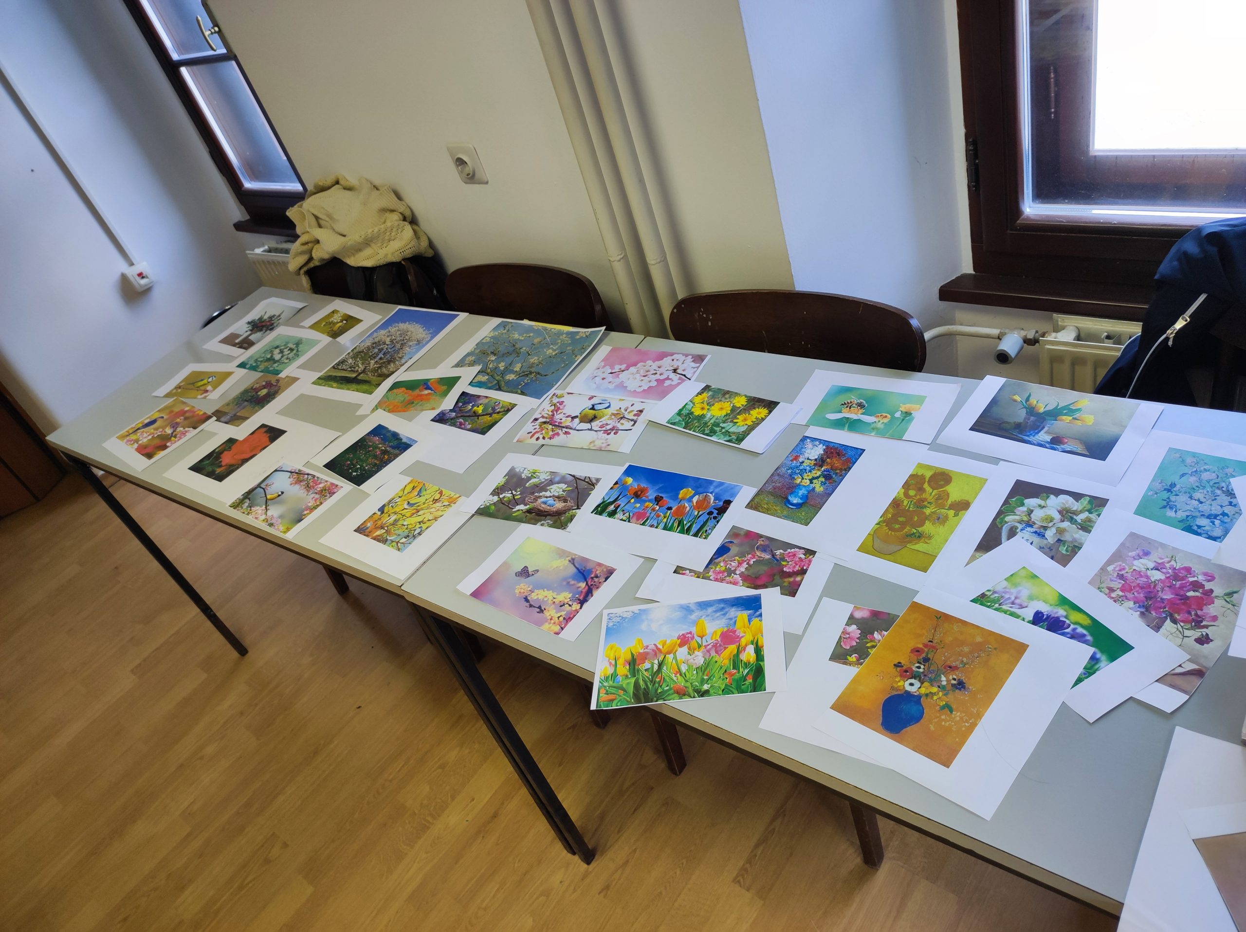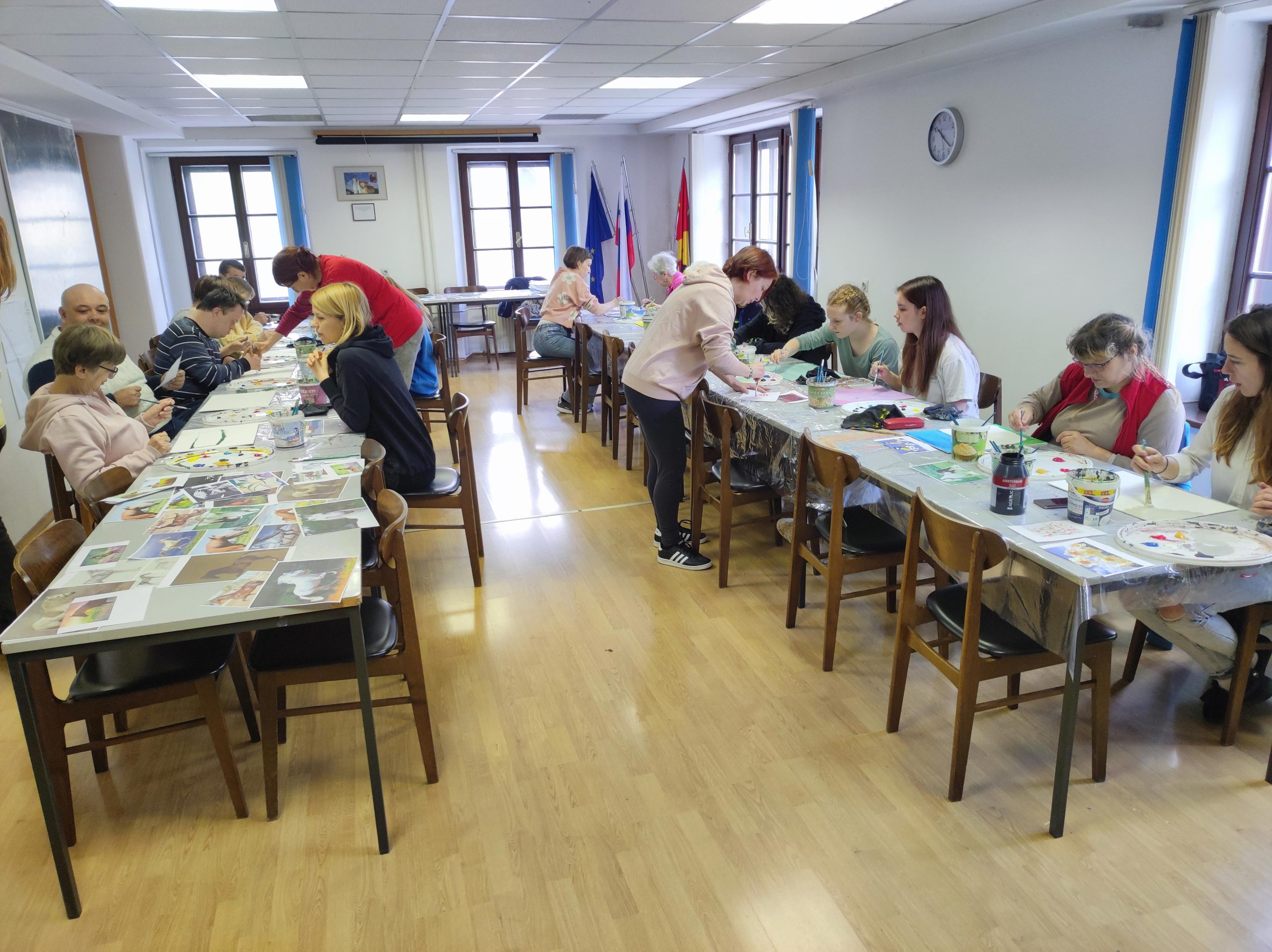 Zaščitili smo mize, pripravili palete z barvami, čopiče, vodo ter platna in si izbrali vsak svoje mesto ustvarjanja. Akademski slikarki Andreja Eržen in Renata Grmovšek sta predstavili tehniko in tematiko slikanja, pri kateri smo ideje lahko iskali tudi v natisnjenih predlogah. Nato smo se vsi skupaj lotili ustvarjanja, pri katerem so nam, poleg mentoric, nudili pomoč tudi spremljevalci in prostovoljki iz Nemčije ter Francije.